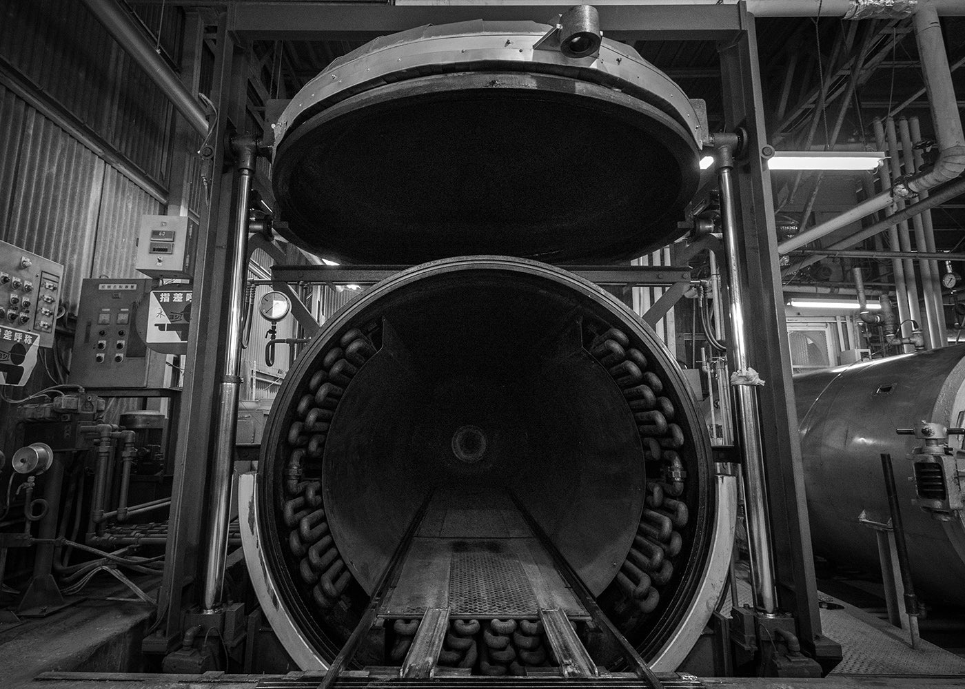 Craftsmen manually glue the upper (shoe body) to the sole and set the sneakers in the hanging shelves. Here, at first glance, the sneakers look close to their finished form, but actually the rubber part is still soft. By putting these in the vulcanizer, the upper and the sole are firmly bonded.