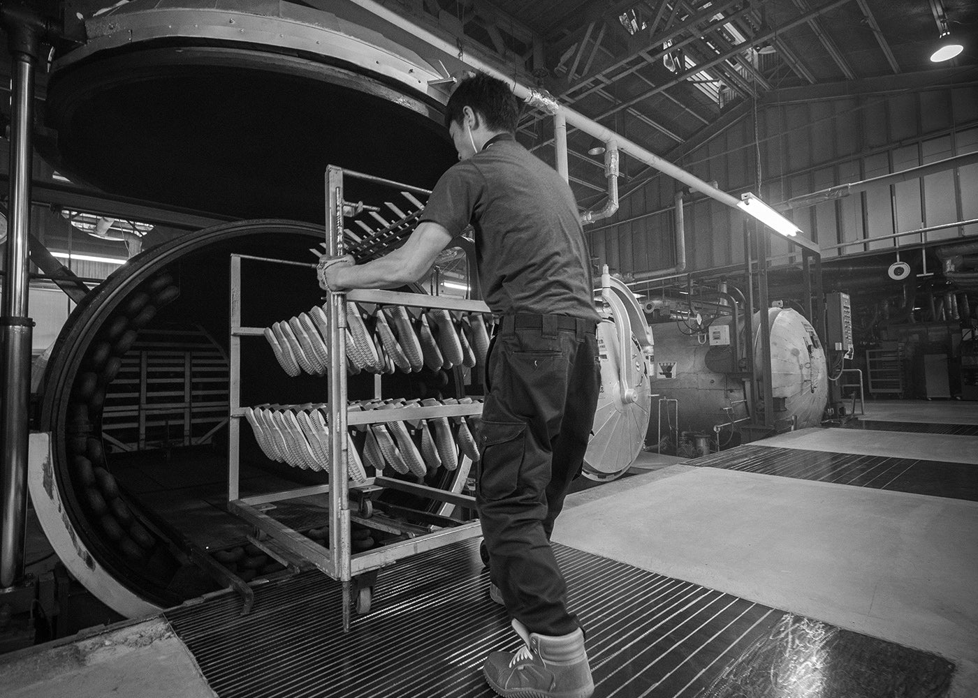 Due to the “vulcanization process” being basically hand work, a great amount of time and labor is taken, and production efficiency is poor. The number of companies in Japan using the vulcanization process has decreased sharply, and it is said that now, including our company, only very few remain. Our factory, which has over 80 years of history, will continue to protect the “vulcanization process” and continue to share this good quality with the world.